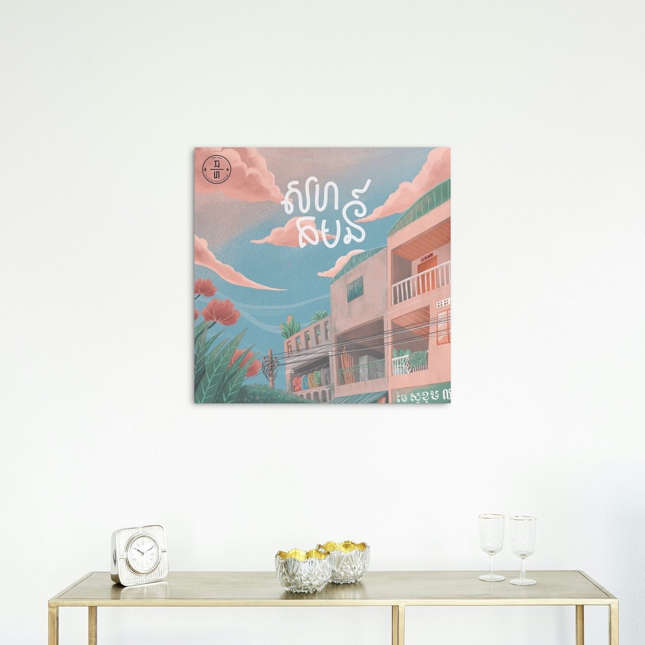 This piece of art was inspired by the scenery of a small community in Prek Ta Kong village, Chak Angre Krom, in the southern part of Phnom Penh, during a clear December morning in the 2019 Cambodian cold season. The sunny weather, cool breeze, and the fragrance of flowers in bloom were accompanied by the unique, indescribable scent of old Cambodian architecture—not entirely pleasant, yet not unpleasant, carrying a distinct sense of nostalgia. Together, these elements created a quietly memorable moment filled with the strong energy of diversity, where Cambodian Cantonese, Chinese, and Khmer communities live harmoniously, sharing joy and supporting one another.